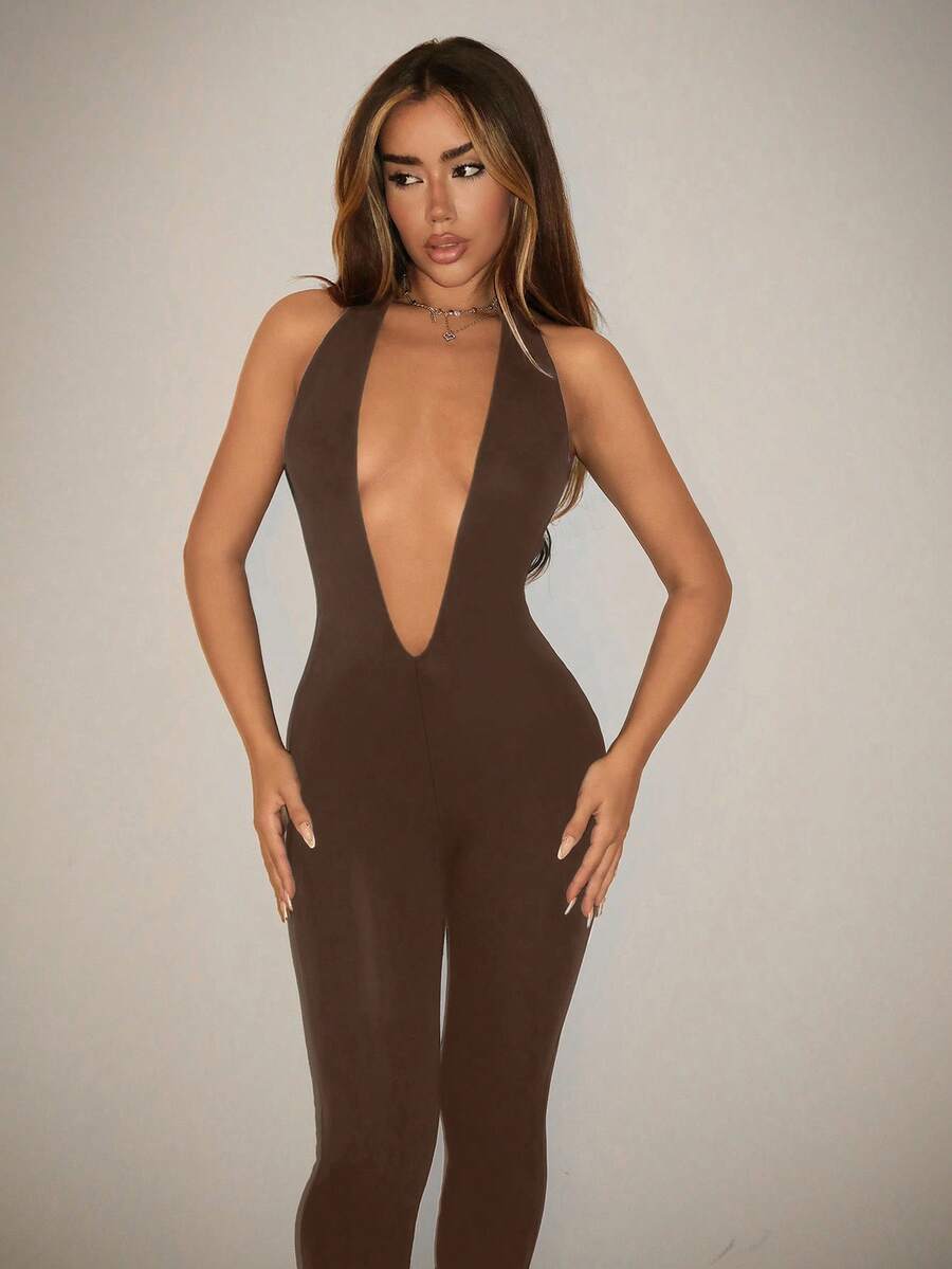 - ボディスーツ 女性用 Y2K セクシー バックレス ネック ノースリーブ タイト ブラックジャンプスーツ パーティー外出用