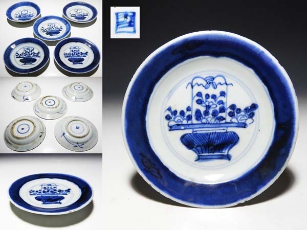 - 【桃】古染付:明末清初期染付花籠図四寸皿 五客