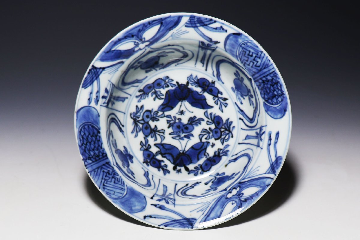 - 【桃】古染付:明末清初期染付向い蝶図兜皿