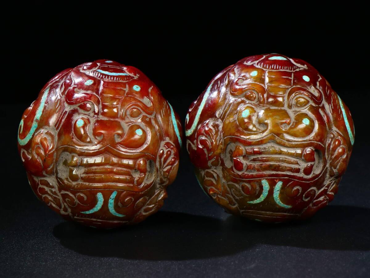 - 旧 清代 和田玉 象眼 綠松石 獸手球 一對 天然石 時代物 中国古美術 古賞物 古置物 唐物 S710