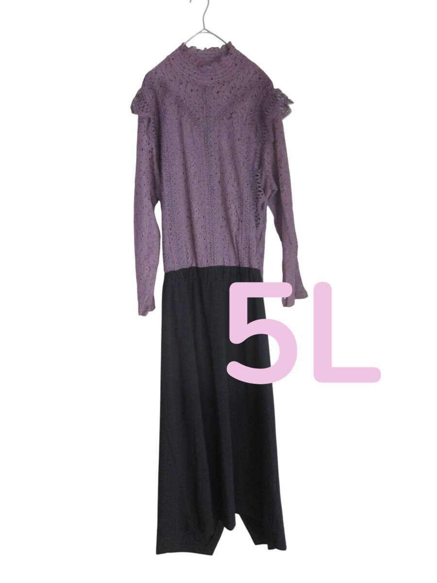 - 送料無料 T77 美品 【5L】 パープルレース チュニック ブラックスカート ドッキング ワンピース 1枚仕立て 大きいサイズ 匿名配