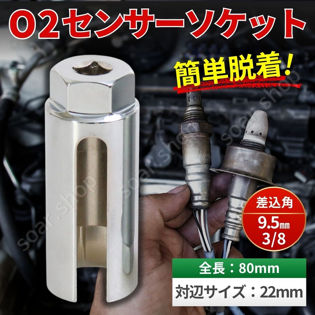 > O2センサーソケット 22mm 差込角 3/8 (9.5mm) 全長80mm 交換 修理 取り外し レンチ 脱着工具 ラムダ オキシゲン 排気 センサー マフラー 車