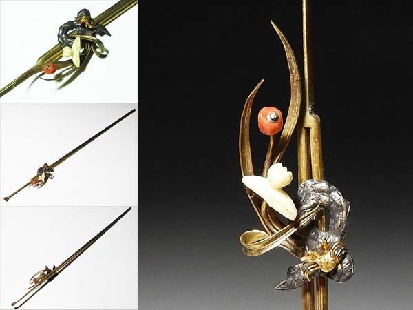 - 【桃】アンティーク髪飾り:金工銀製鍍珊瑚鯨歯造り太湖石に蘭簪