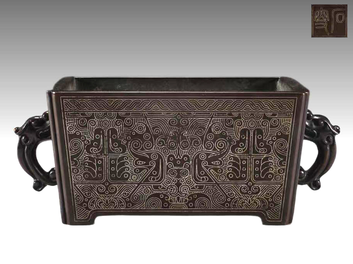 - ▽鴻▽明時代 石叟銘 銅胎 錯銀絲獣面紋馬槽香炉 時代物 中国古美術 骨董品