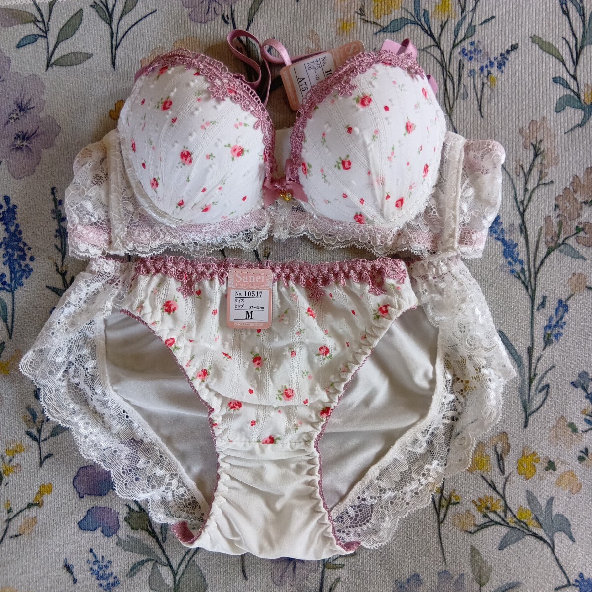 - ホワイト地に赤お花レース模様のブラジャーショーツ セット A75 ショーツ(M)