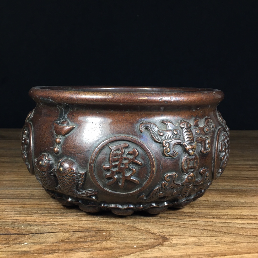 - 【超珍館蔵 銅製 招財聚寶盆 熏香炉 置物 賞物 古賞物 古董品 古美術品 時代物 旧家蔵出 稀少珍蔵品