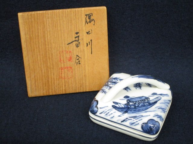 > F2155 陶磁器「平安 高野昭阿弥『隅田川 香合』」在銘/共布/共箱付 陶芸 茶道具 茶陶 香道具 工芸 染付 京焼 蓋物