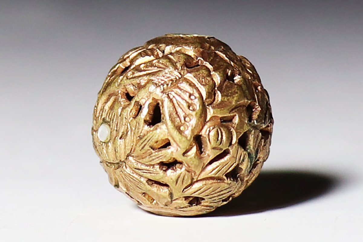 - 【桃】提げ物:金工銅地鍍金透かし彫り菊花図緒締め玉