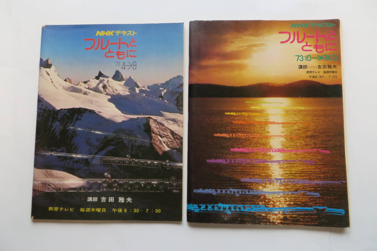 > 9104 NHKテキスト フルートとともに 2冊 1973/4~9(ピアノ伴奏楽譜欠,書込み有)1973/10~1974/3(ピアノ伴奏楽譜付き) ヤケ、角折れ等傷み有
