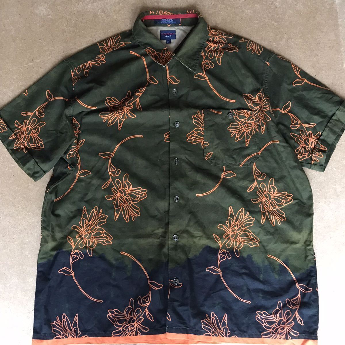 - 7-6 トミージーンズ 花柄 総柄 グラデーション 濃緑 半袖シャツ L ビッグサイズ Tommy Jeans