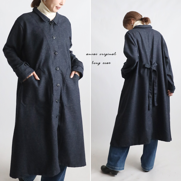 - 秋の新作 暖か縮絨メルトン ウールmix 角襟 ロングコート 後ろリボン スリット入り 羽織 ジャケット K37