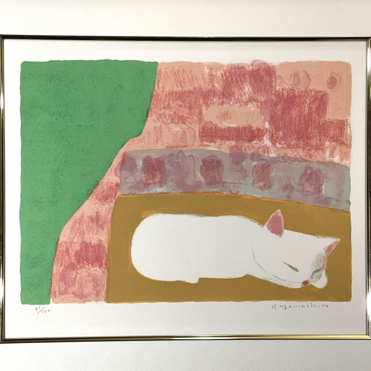 真作■リトグラフ■山城隆一■『ねこ 三態・春』■希少限定・本人サイン有 額装 白猫 猫の人気作家 朝日広告賞 作品集「猫は猫の夢を見る」