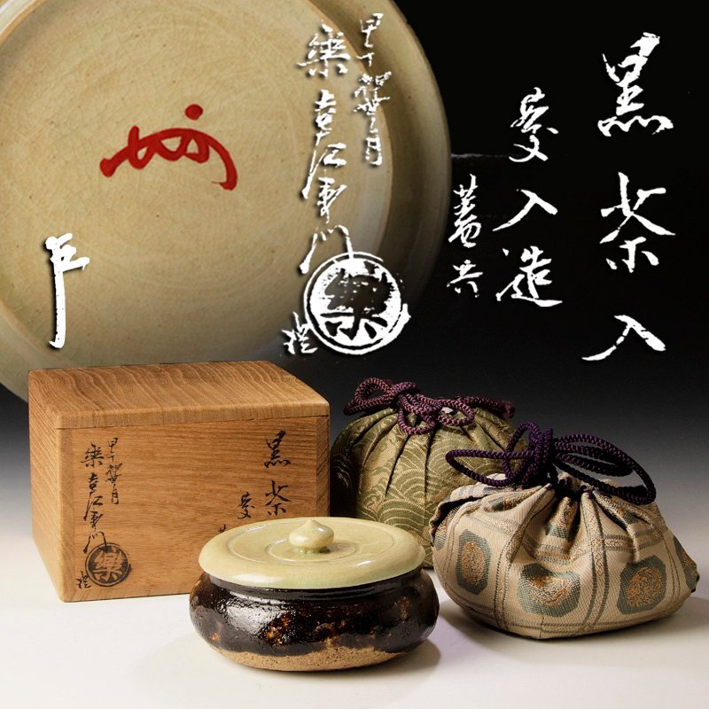 > 【古美味】十一代楽吉左衛門(慶入)『即中斎書付』黒茶入 十四代(覚入)識 茶道具 保証品 6SxT