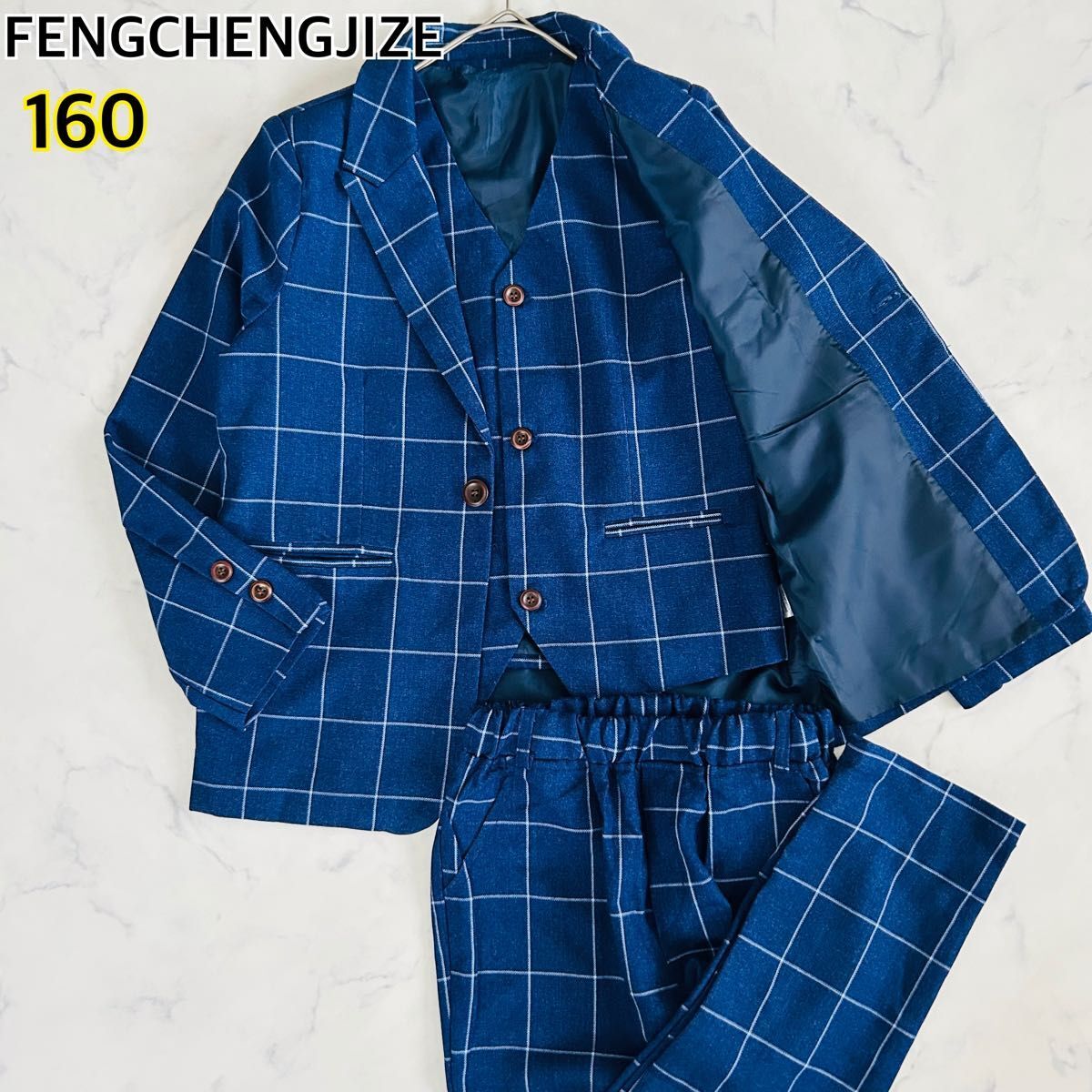 > FENGCHENGJIZE フェンチェンジゼ キッズスーツ フォーマル 3点 3ピース ベスト チェック ブルー 男の子 160 卒業式 入学式 発表会