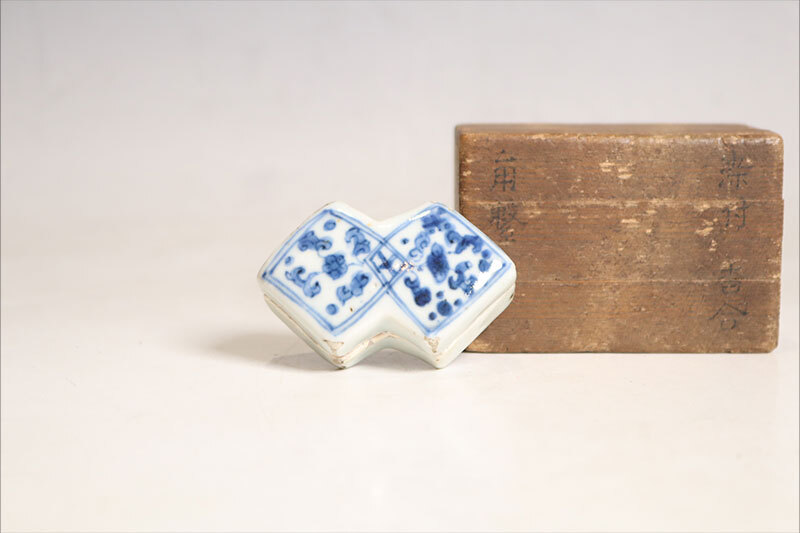 - 中国美術 青花花卉紋蓋盒 南京古染付香合 木箱附 (P139)