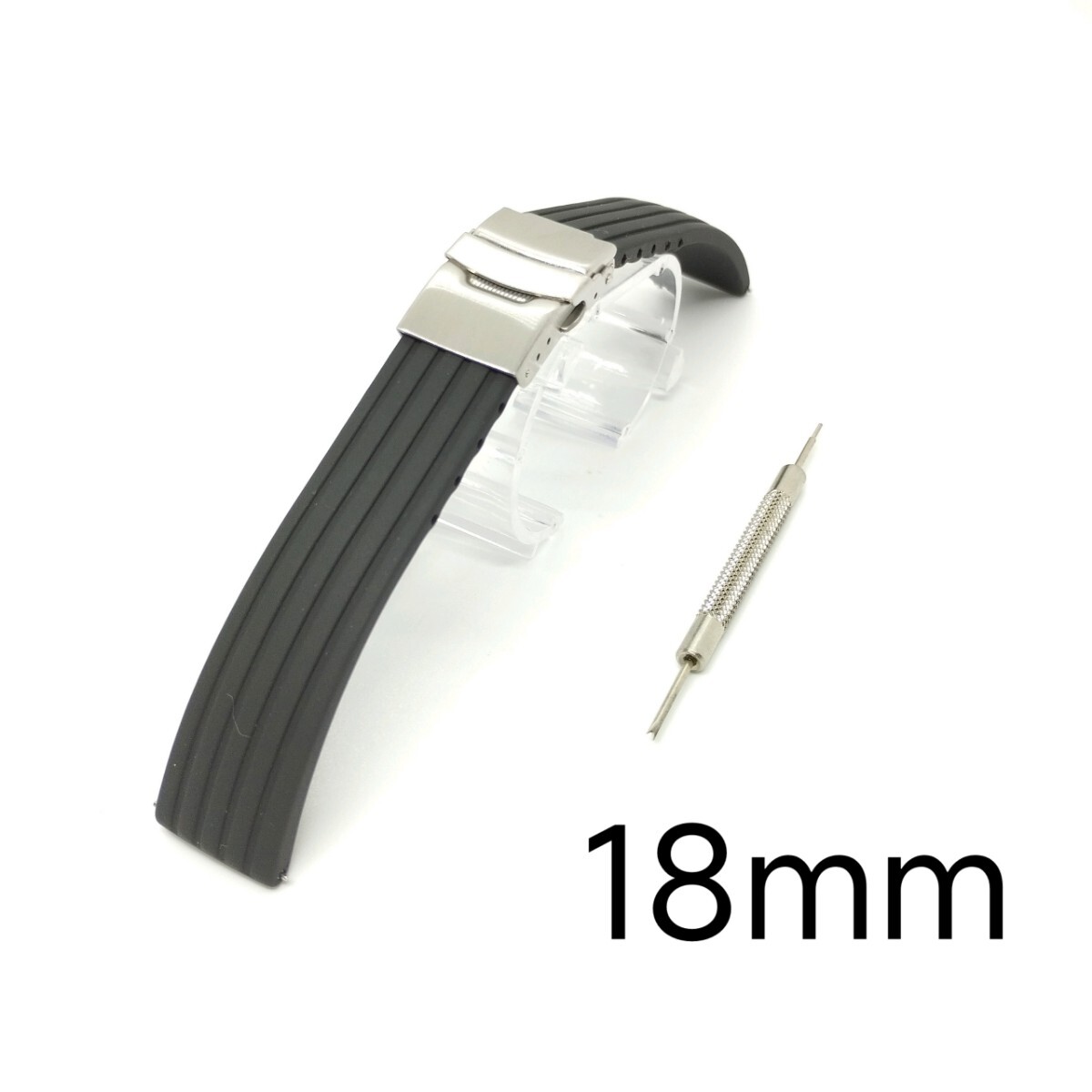 - 送料無料 18mm 腕時計 交換ベルト シリコン 黒 ブラック プッシュ式 バックル バネ棒外し付き B7