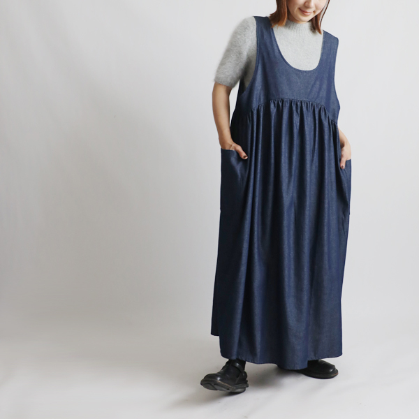 > 秋の新作 甘織デニム かぶるだけでお洒落になる エプロン ワンピース ノースリ ゆったり ジャンスカ お洒落 コットン F82