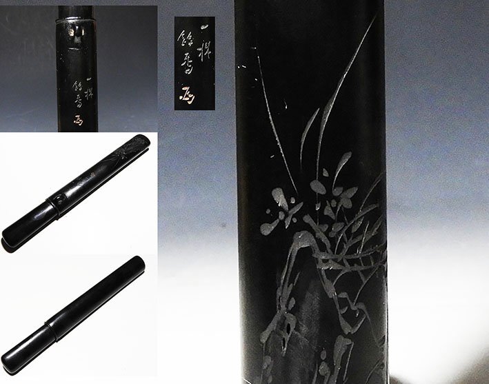 - 【桃】提げ物:唐木彫太閤石に蘭の図煙管筒