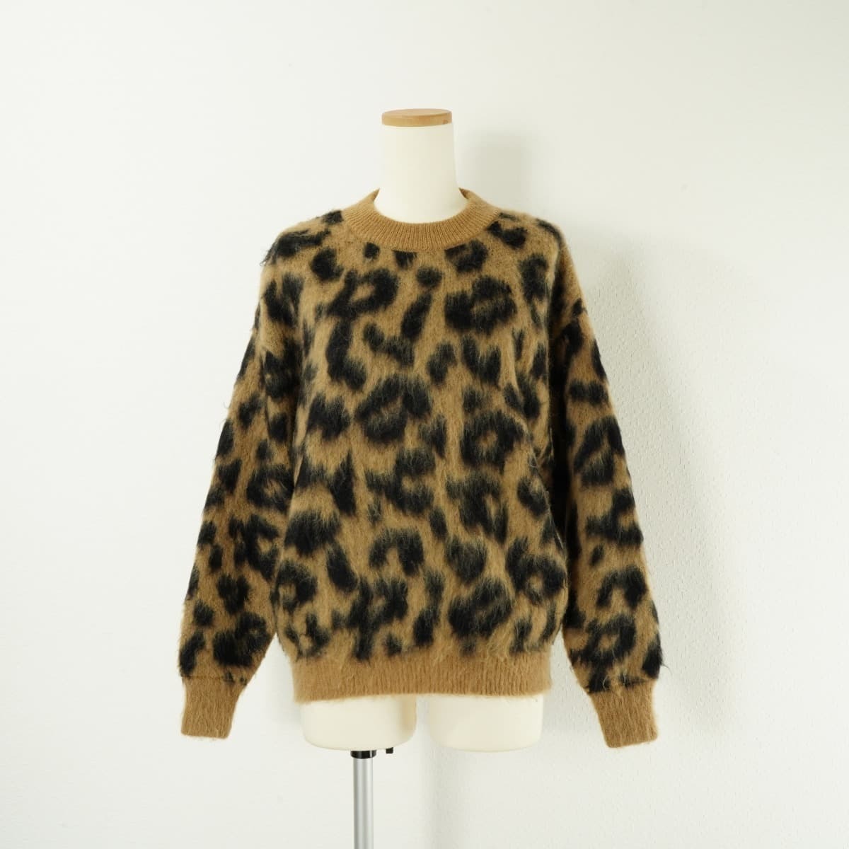 コメント:柔らかなキッドモヘア(生後一年未満の子山羊から刈り取った毛)を使用したレオパード柄のジャガードニット。モヘアならではの毛足の長さとふんわり感が柄の印象も和らげ、オーバーなサイズなデザインです。モヘアグレードの中で最も細く柔らかな糸として珍重され、非常に高価な素材です。優れた光沢と発色性をもち滑らかでソフトな肌触りが特徴的で、断熱性と放湿性にも優れているアイテムです。