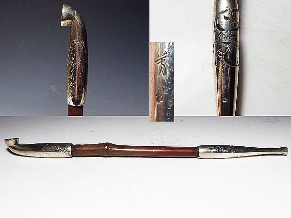 - 【桃】提げ物:金工銀煙管印刻双馬図 芳秋刻