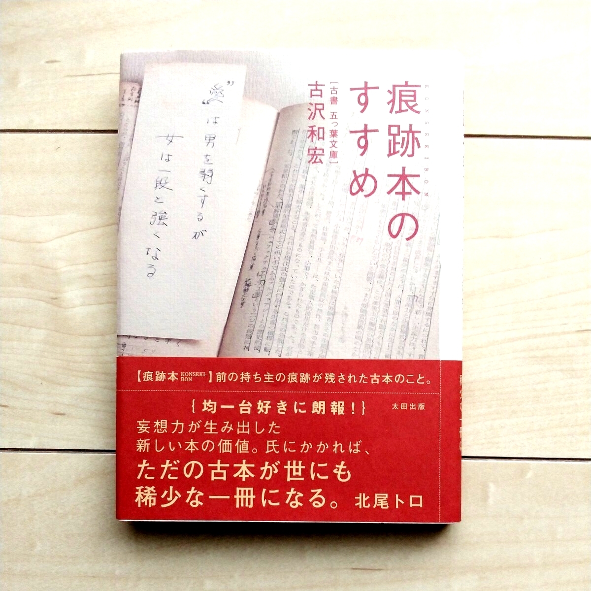 - ■『痕跡本のすすめ』古書「五つ葉文庫」古沢和宏著。2012年初版カバー帯。株式会社太田出版。現役古書肆店主に依る瑕疵有り本の奥義開陳。
