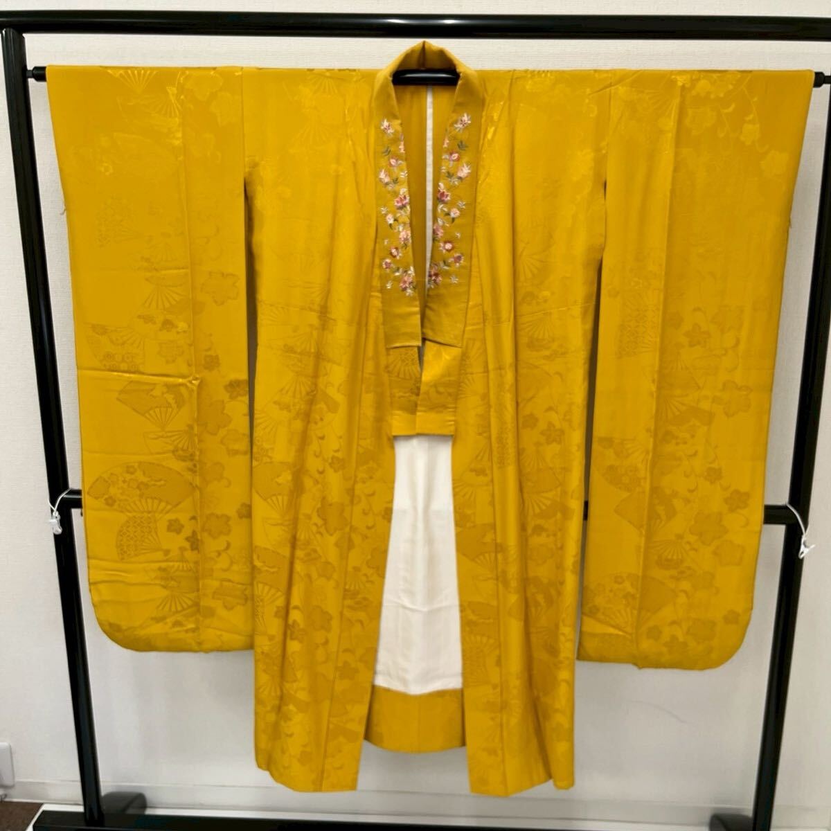 - 振袖用長襦袢 やまとお誂え 辛子色 扇子に花柄 花唐草の地紋 裄65 正絹 着物 W-4771