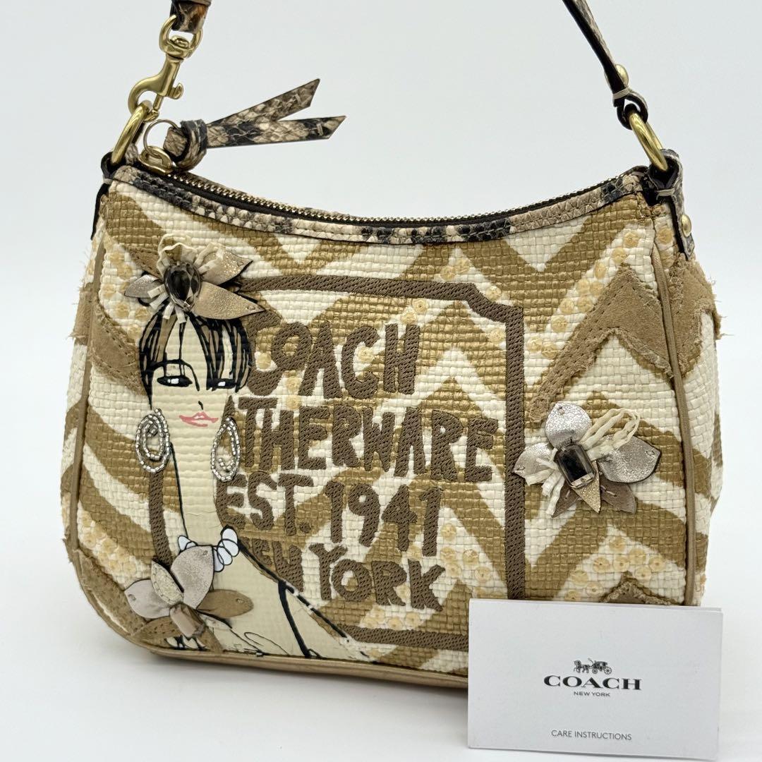 - 【良品】COACH コーチ ハンドバッグ ミニバッグ ラフィア レザー スパンコール パイソン型押し レザー ベージュ レディース AG331011C