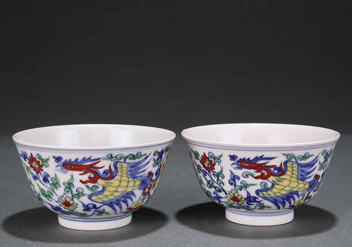 - ▽鴻▽明時代 陶磁器 大明成化年製 斗彩鳳紋杯一対 共箱 時代物 中国古美術 骨董品