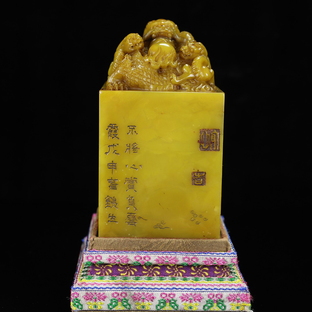- ▽鴻▽清朝時代 寿山石 田黄石彫 蒼龍鈕印章 鉄生作 箱付 時代物 中国古美術 骨董品