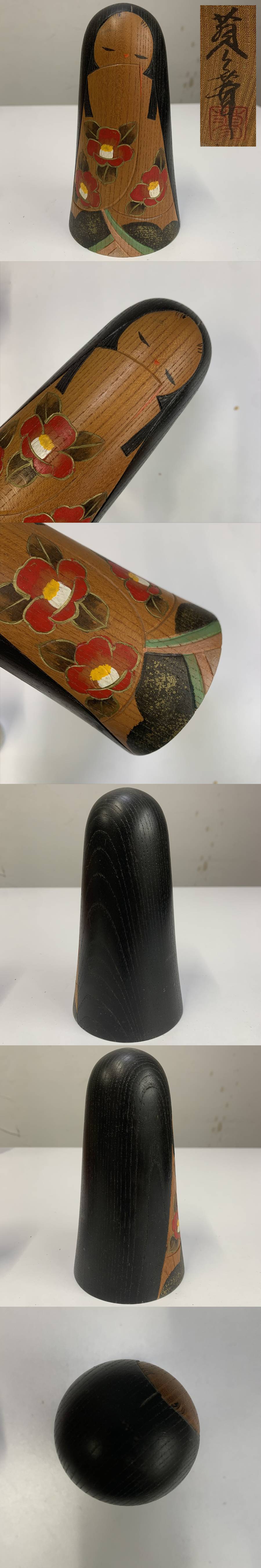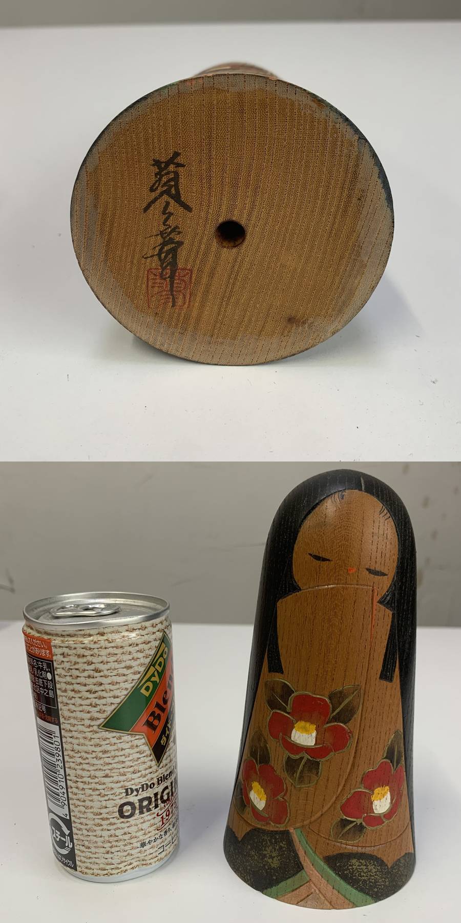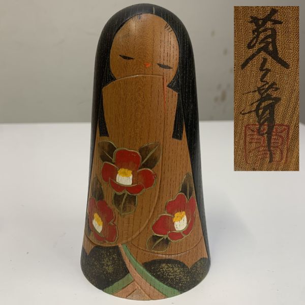 - 青木蓼華 創作こけし 椿模様 姫 女性 15cm 内閣総理大臣賞受賞作家