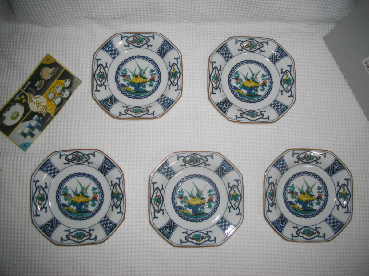 - 【九谷焼・青風】 5号皿揃 八角銘々皿 5枚 ◆ 宝紋花鳥