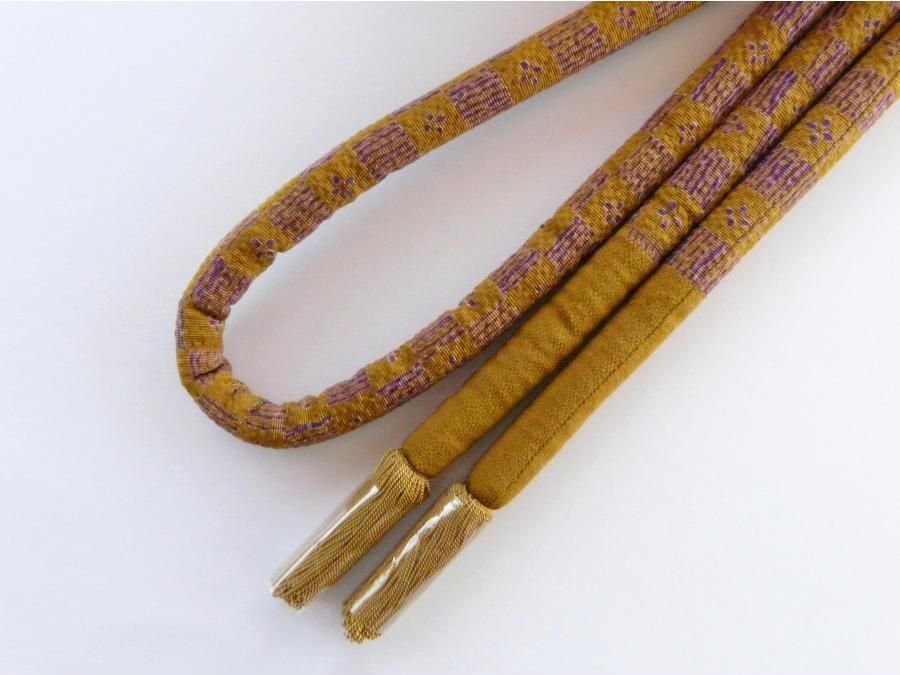 - 正絹帯締め 丸ぐけ 茶幾何学文様 よりふさ 新品 010