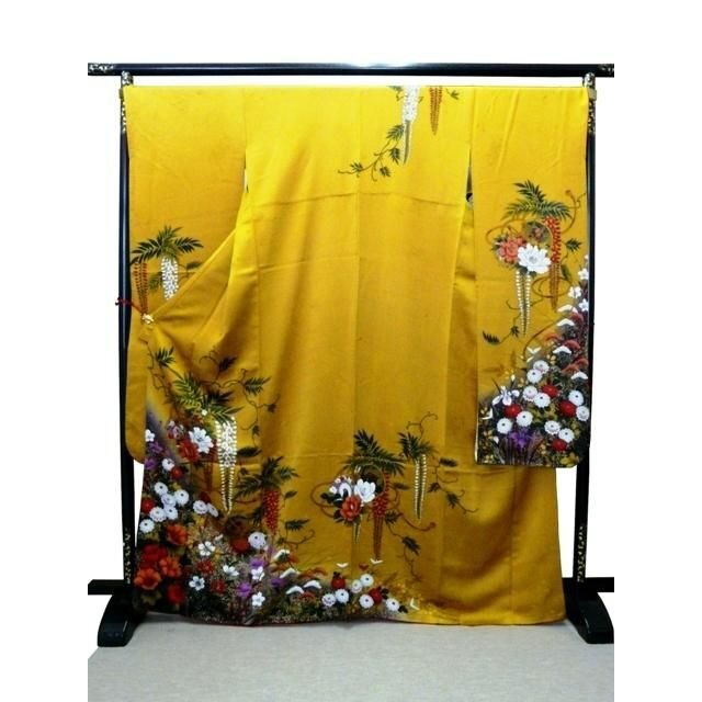 - 中古 振袖 正絹 試着品 黄金色 四季草花 鼓 着丈159cm 裄69cm 仕立上り 423 送料無料