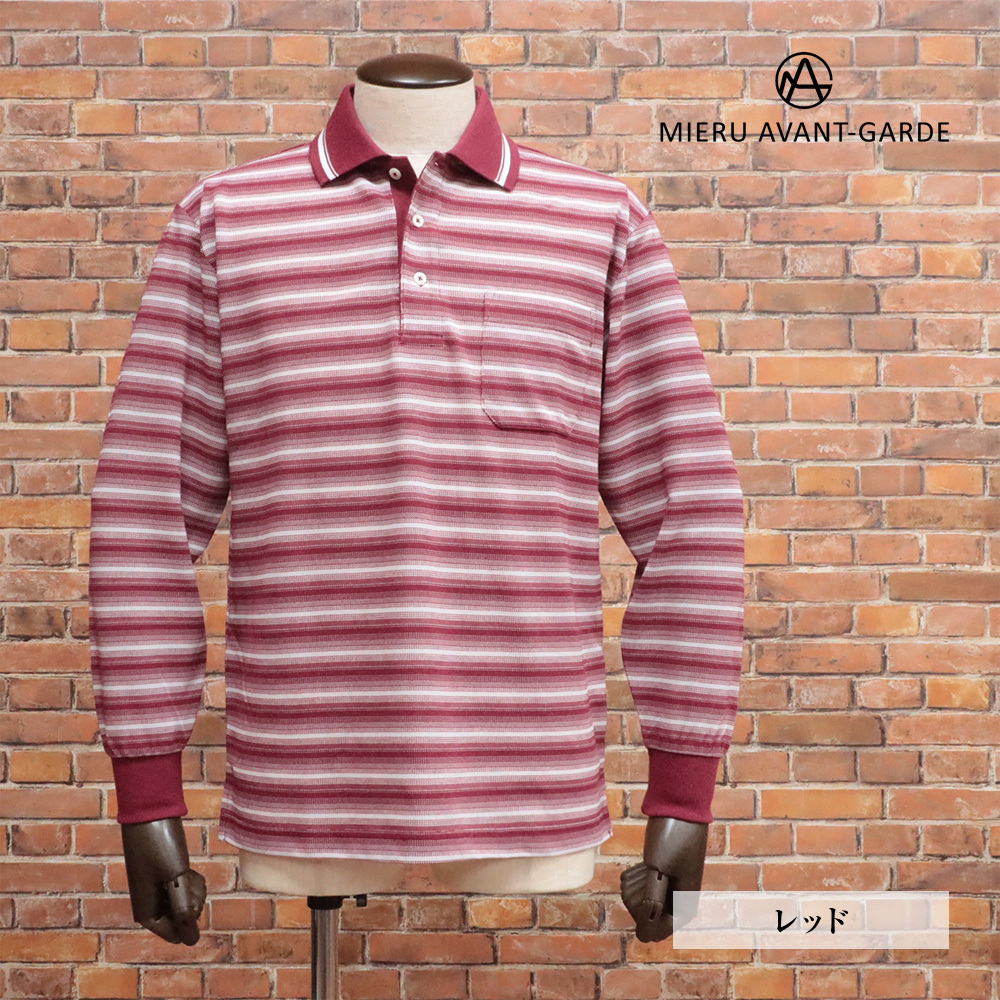 > MIERU/Lサイズ/ポロシャツ 清涼カノコ 涼しい 伸縮性 ボーダー 胸ポケット ミエル 長袖 新品/赤/レッド/kh122/