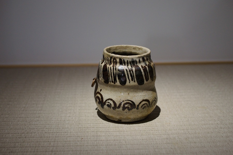 志野織部の掛花入です。愛らしい姿と絵付けです。肌もよく、もともとは筒向付の生まれでしょう。こうした筒向付は、火入に転用される場合が多いのですが、この作品のように、掛花入にされる場合もあります。おおらかで、伸びやかな佇まいが、花入としても打ってつけのものと判断されたことでしょう。