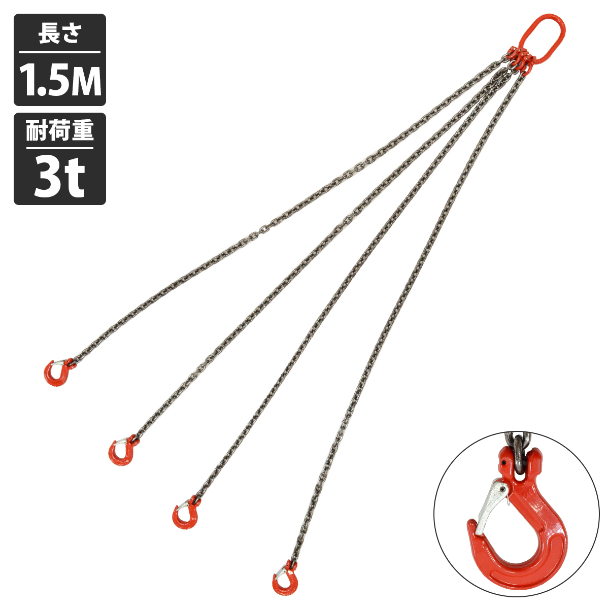 - [ 3t 1.5M ]4本吊り チェーンスリング 吊り スリング チェーン フックタイプ リング付き 径6mm 長さ 1.5m 耐荷重 3000kg
