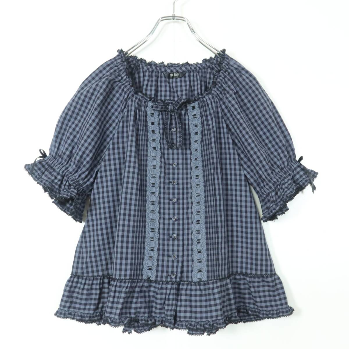 - 【美品】ピンクハウス★ギンガムチェックが可愛い♪ はしごレースとパフスリーブがガーリーなオーバーブラウス グレー系 z15807