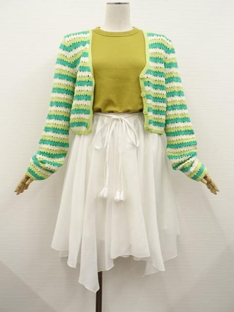 > 美品 ZARA等 カーディガン+Tシャツ+膝丈スカート コーデ3点セット M相当 白×緑 ボーダー/緑系/白 シンプル・カジュアル系 20代・30代~