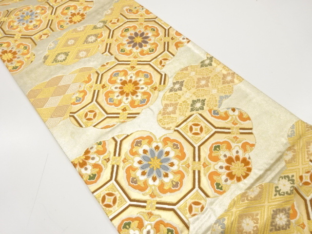 > 美品 未使用品 引箔 雲取りに花蜀江・花菱模様織り出し 袋帯 (未仕立て) (AJAF1K-027)