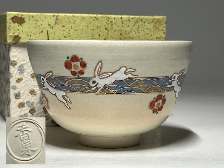 - 【瑞】香泉作 京焼 色絵 波兎梅紋 茶碗