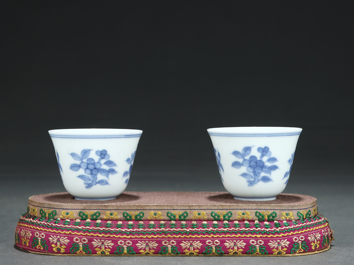 - ▽鴻▽明朝時代 陶磁器 成化年製 青花四季花果紋杯一対 箱付き 染付 時代物 中国古美術 骨董品