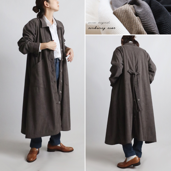 - 秋の新作 105cm丈 コーデュロイ生地 角襟 ロングコート 後ろリボン スリット入 羽織 ジャケット グレー K28A◎