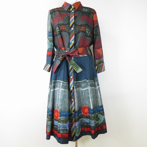- #a デシグアル Desigual ワンピース シャツワンピ 42 緑系 マルチ 総柄 七分袖 ウエストリボン付き レディース [957176] k01