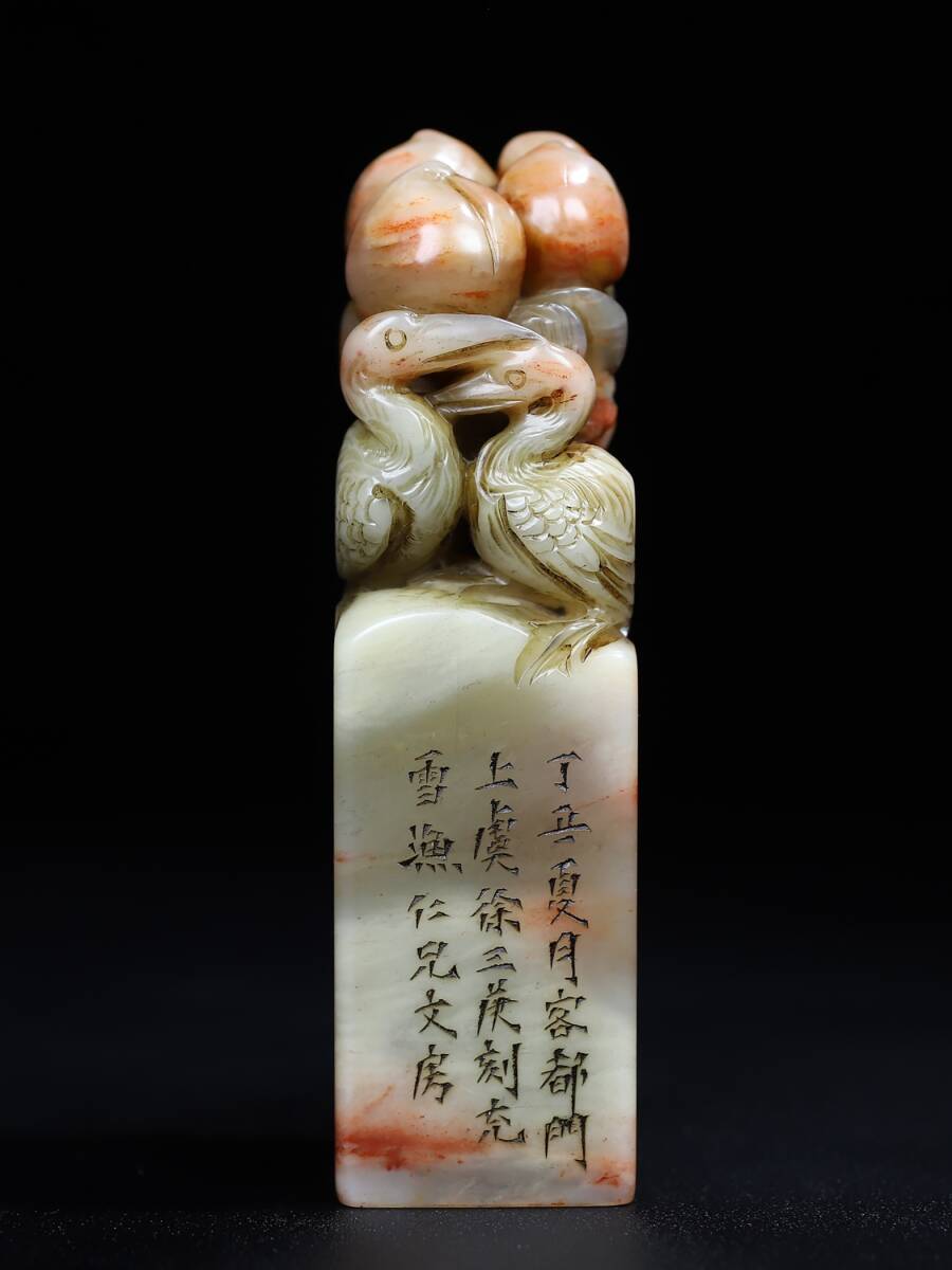 - ◆珍蔵◆中国古美術 清時代 古寿山石彫り双鶴 印章 箱付 細密細工造 置物 古賞物 骨董品 時代物 A17