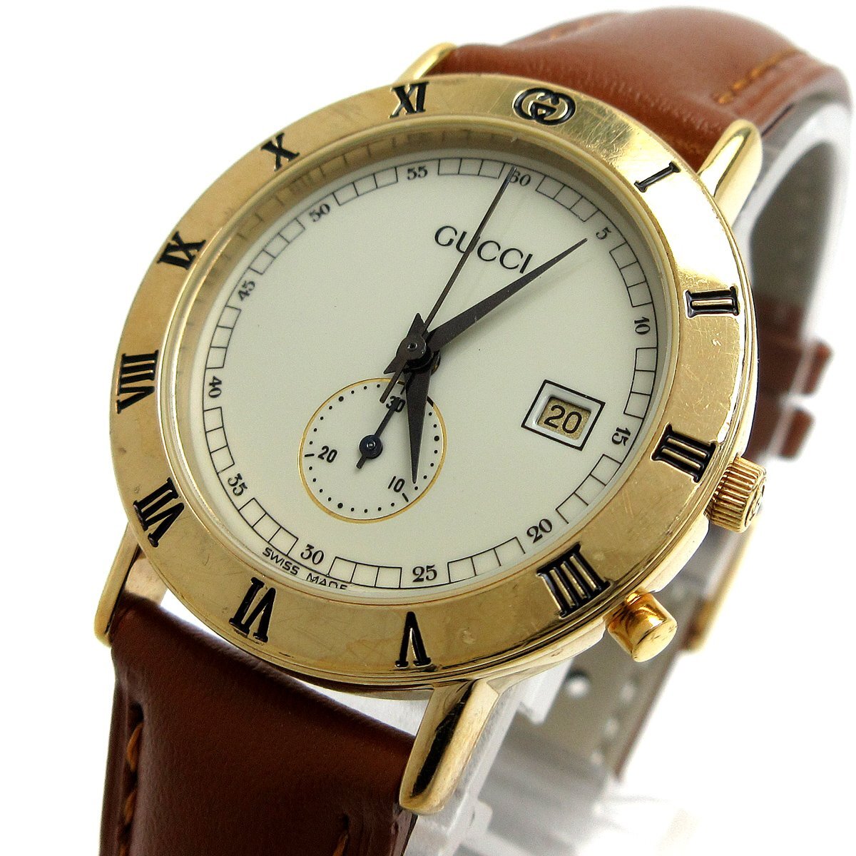 > グッチ クロノグラフ レディース ゴールド アイボリー デイト 3800Jr 時計 GUCCI 婦人 クォーツ 箱 稼動品 希少