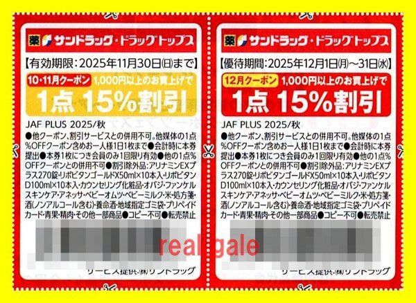 - ■■送料無料■■サンドラッグ/ドラッグトップス 15%割引券■①2025年11月30日まで ②12月1日~12月31日まで■