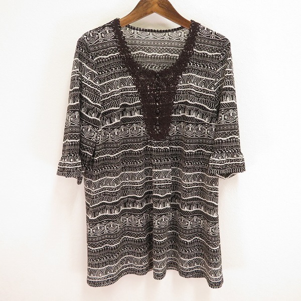 > #s レリアン Leilian チュニック 13+ 黒 白 茶 総柄 アジアン柄 13号 レース 五分袖 カットソー 日本製 美品 レディース920086 k01