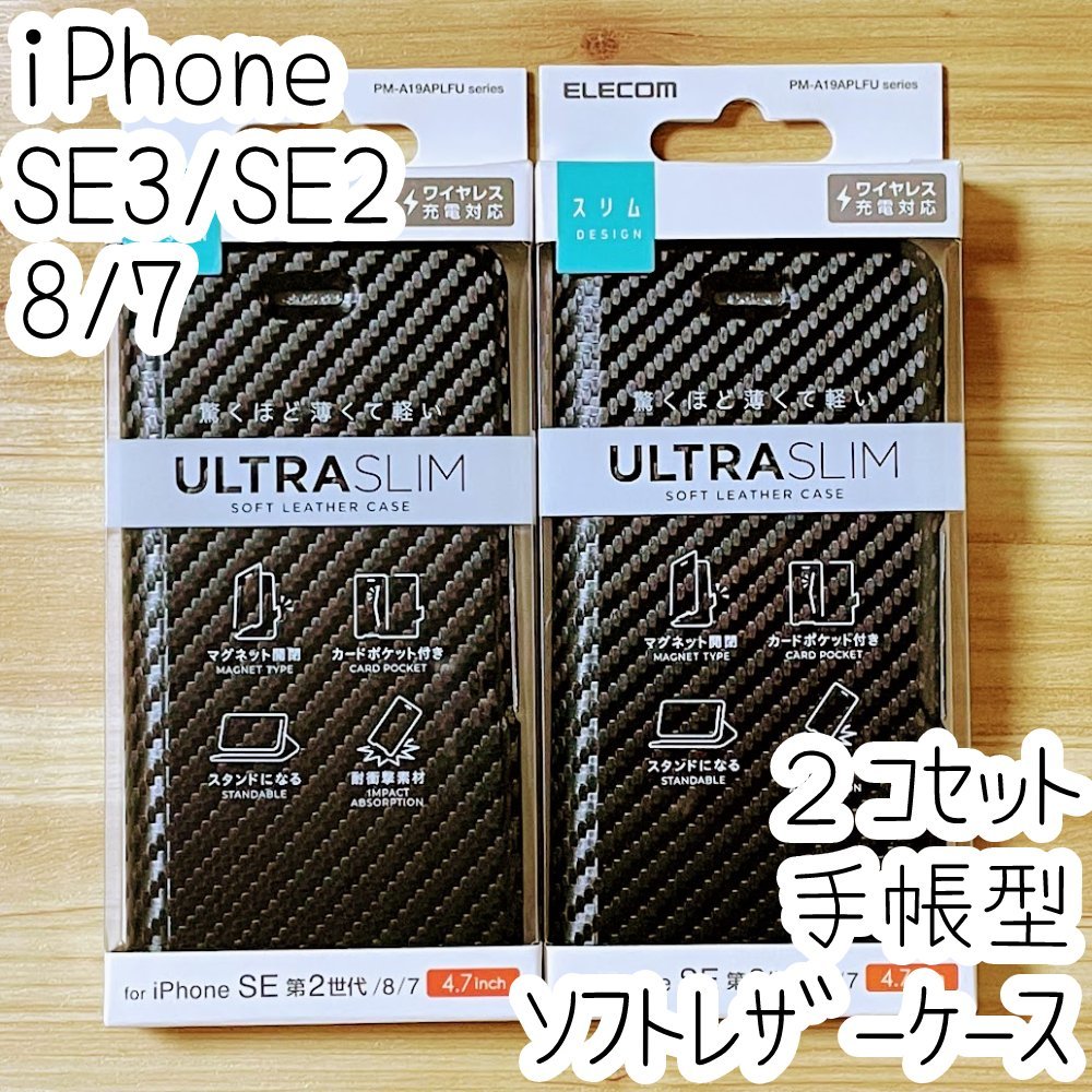- 2個 エレコム iPhone SE3・SE2・8・7 手帳型ケース 第3世代 ウルトラスリム マグネット 磁石 ソフトレザーカバー カーボンブラック 062