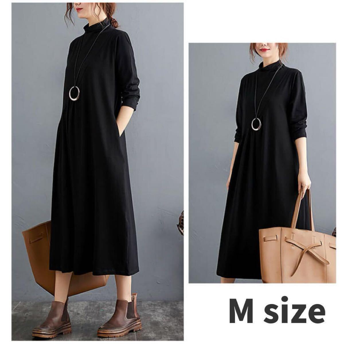 - Ha73★ギャザーワンピース ロングワンピース 長袖ワンピース 無地 ブラック 黒 シンプル 上品 きれいめ 細見え 秋 冬 通勤 レディース M
