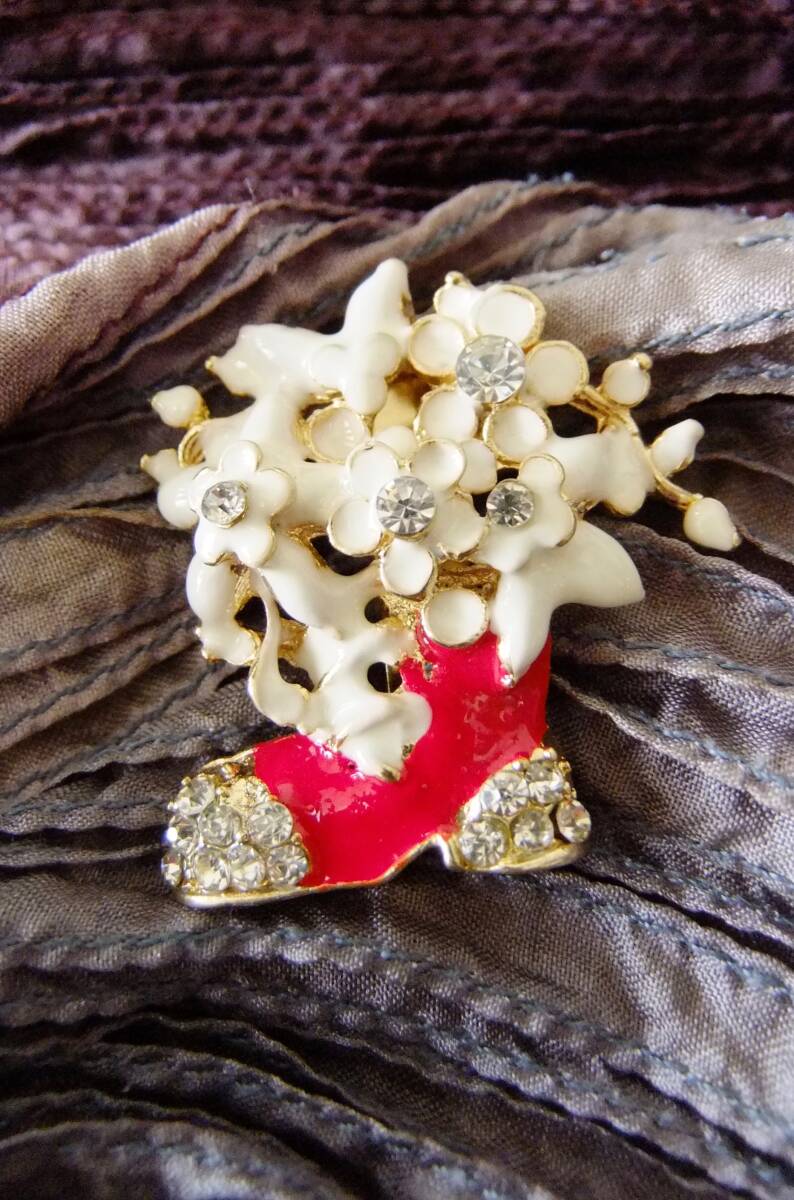 - 未使用品:訳あり品:ゴールドカラー、クリアストーン、白いお花とブーツのブローチ B-8